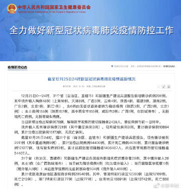 截至12月25日24时,据31个省(自治区、直辖市)和新疆生产建设兵团报告,现有确诊病例2011例(其中重症病例9例),累计治愈出院病例94430例,累计死亡病例4636例,累计报告确诊病例101077例,现有疑似病例3例。累计追踪到密切接触者1406467人,尚在医学观察的密切接触者54407人。
