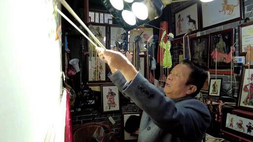 齐鲁网·闪电新闻12月26日讯 走进台儿庄古城,步行不多时,就听到了一阵独特的曲调。独具特色的古朴建筑前,一帘白色的幕布上,正上演着精彩的皮影戏,讲述着抗战时期台儿庄人民的英勇事迹,而幕布后面,操纵着皮影人物的正是61岁的鲁南皮影艺术传承人陈守科。