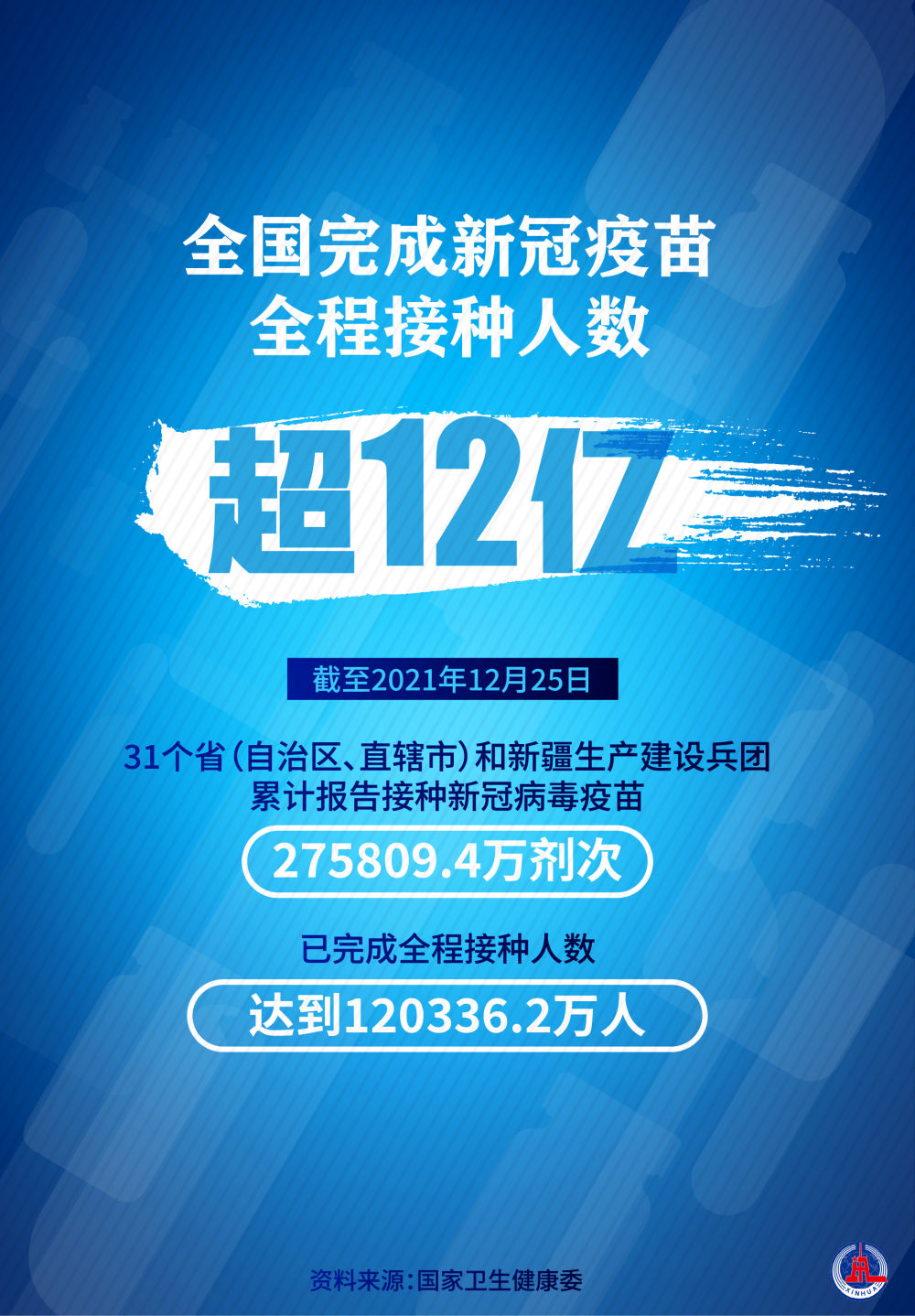 据国家卫生健康委相关负责人介绍,截至2021年12月25日,31个省(自治区、直辖市)和新疆生产建设兵团累计报告接种新冠病毒疫苗275809.4万剂次,已完成全程接种人数超过12亿,达到120336.2万人。详情>>>