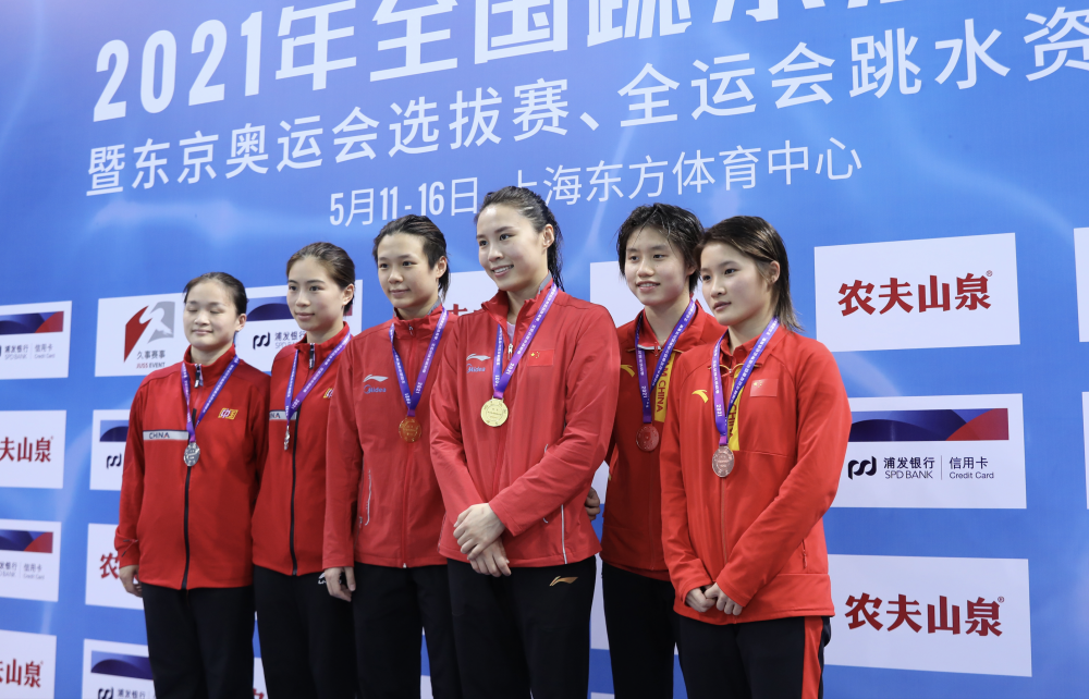 5月11日,女子双人3米跳板冠亚季军在颁奖台合影(左起王伟莹/罗春晓、王涵/施廷懋、韦颖/黄小惠)。新华社记者方喆摄