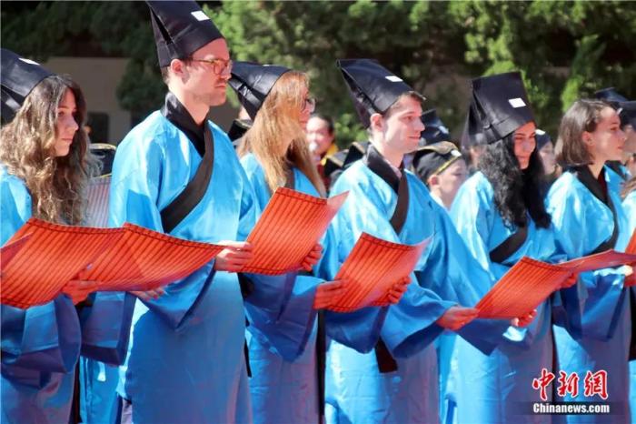 2018年9月,2018姑苏孔子文化节暨祭孔大典在江苏苏州文庙举行。仪式上,苏州大学的20多位外国留学生身穿中式传统礼服、手捧竹简,用汉语齐声诵读《论语》。中新社发王建康 摄