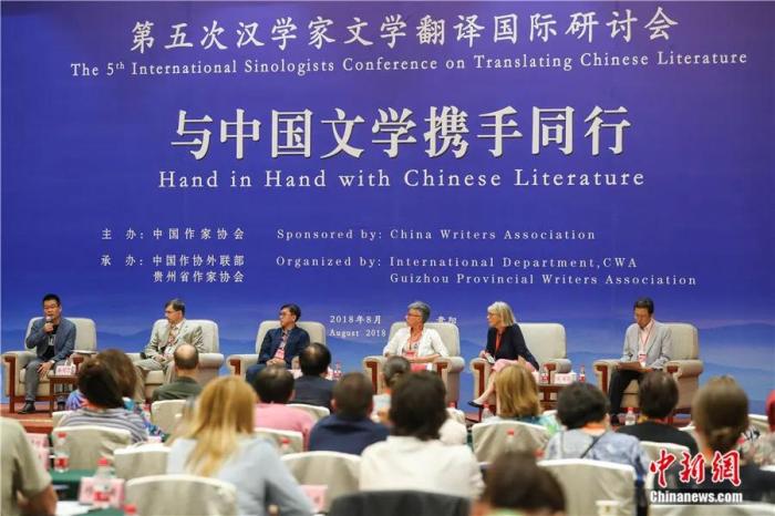 2018年8月,第五次汉学家文学翻译国际研讨会在贵阳市花溪开幕,来自法国、德国等24个国家38位翻译家与莫言、铁凝、贾平凹、余华、阿来等50多位中国作家参加研讨会。中新社发贺俊怡 摄