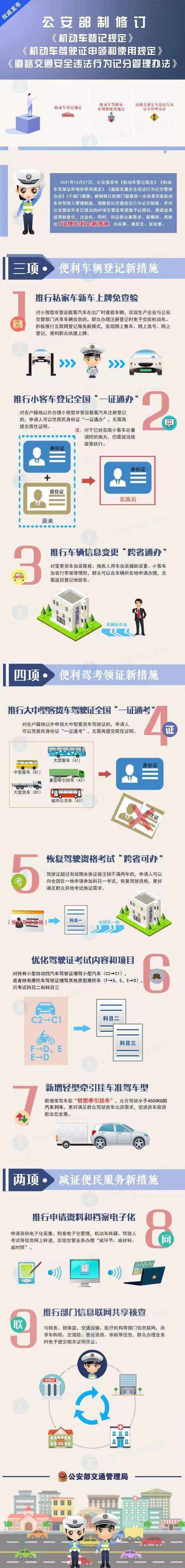 近日,公安部发布了新制修订的《机动车登记规定》《机动车驾驶证申领和使用规定》《道路交通安全违法行为记分管理办法》3个部门规章。此次制修订坚持以人民为中心,统筹发展和安全,进一步改革完善机动车登记、驾驶人管理和交通违法记分制度,推出更多“我为群众办实事”新措施,健全车辆和驾驶人安全准入机制,严密交通管理执法监督制度,深入推进更高水平的平安中国建设,不断增强人民群众获得感、幸福感、安全感。《机动车驾驶证申领和使用规定》和《道路交通安全违法行为记分管理办法》将自2022年4月1日起实施,《机动车登记规定》将自2022年5月1日起实施。