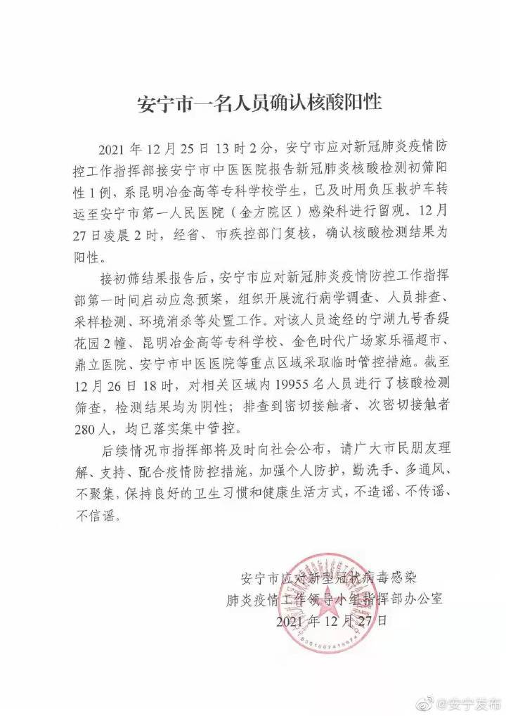 2021年12月25日13时2分,安宁市应对新冠肺炎疫情防控工作指挥部接安宁市中医医院报告新冠肺炎核酸检测初筛阳性1例,系昆明冶金高等专科学校学生,已及时用负压救护车转运至安宁市第一人民医院(金方院区)感染科进行留观。12月27日凌晨2时,经省、市疾控部门复核,确认核酸检测结果为阳性。