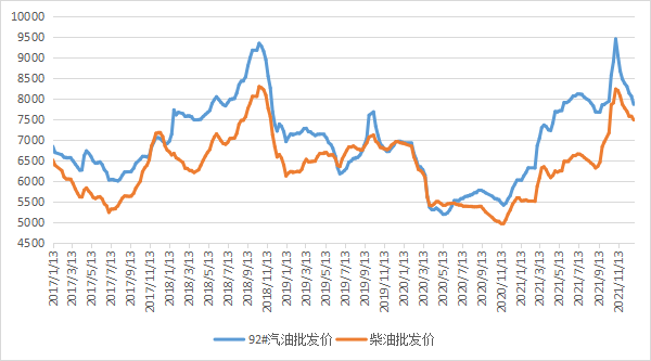 图表:中国汽柴油批发价格指数周度均价走势图(单位:元/吨)