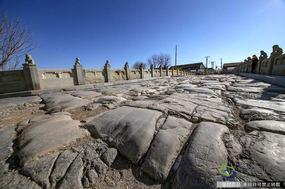 据当代古建专家王世仁老先生讲,这种栏板内外两面均浮雕纹饰的古桥唯有通运桥独见,而且荷叶形瓶口形状不一,寥寥几道叶脉纹也没有雷同之笔,简练而有神韵。栏端设麒麟饯栏兽石雕,双角密鳞,昂头蹲坐,阳具粗壮,颇显雄风。桥面所铺为艾叶青条石,错缝顺砌,车痕累累,布满桥面,十分古拙壮观,这是悠悠岁月的记录,是大运河北端码头商业繁旺的写照。
