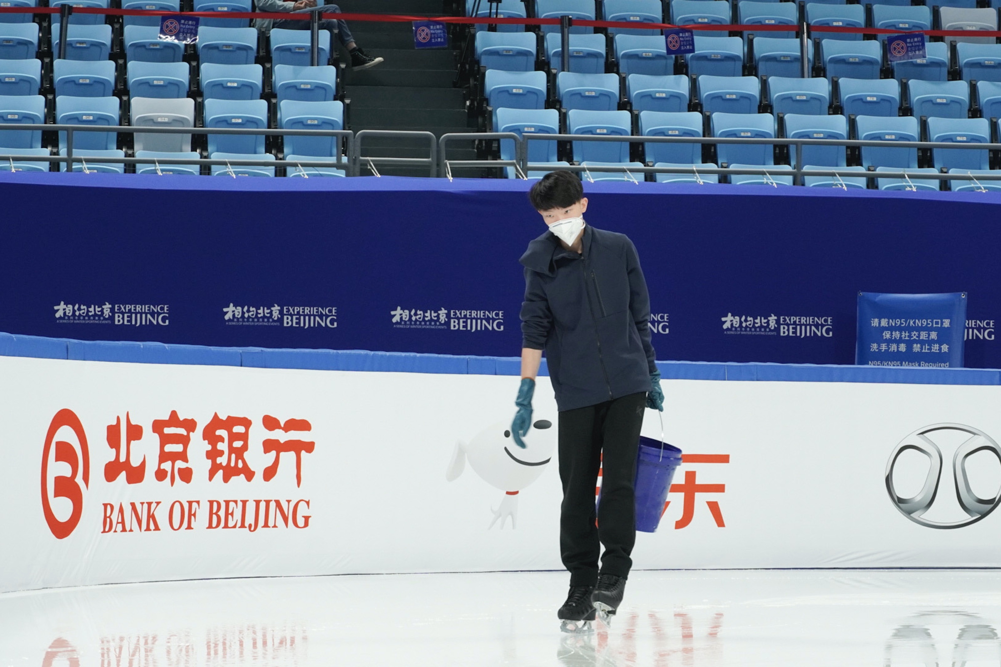 2021-2022赛季亚洲花样滑冰公开赛前,杨曦为赛前训练的运动员补冰。新华社发(樊康摄)