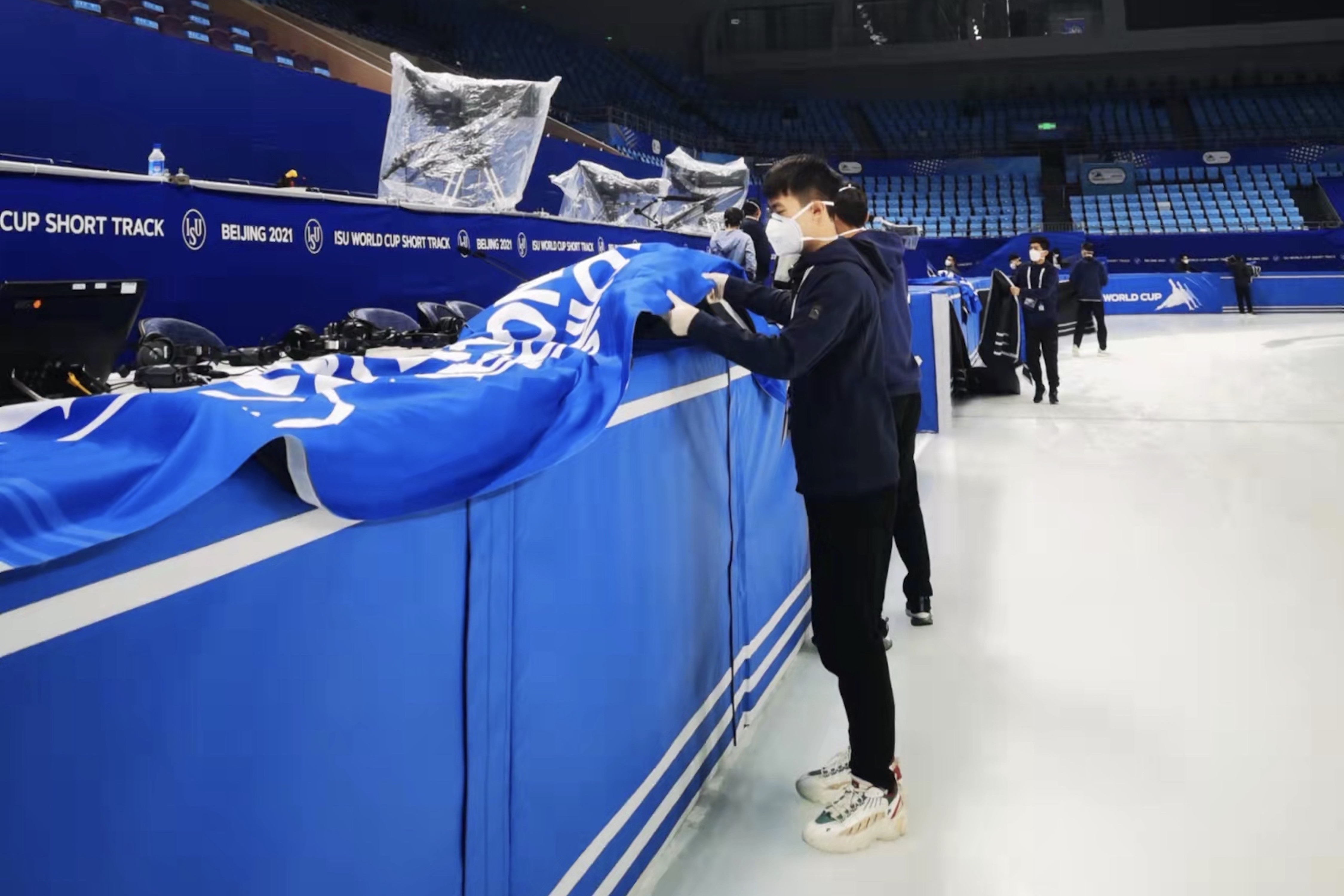 崔良浩将在短道速滑赛中负责防护垫检查。“这是速度与激情的项目。”他介绍,如果运动员摔倒在防护垫上,志愿者要及时将垫子复位。