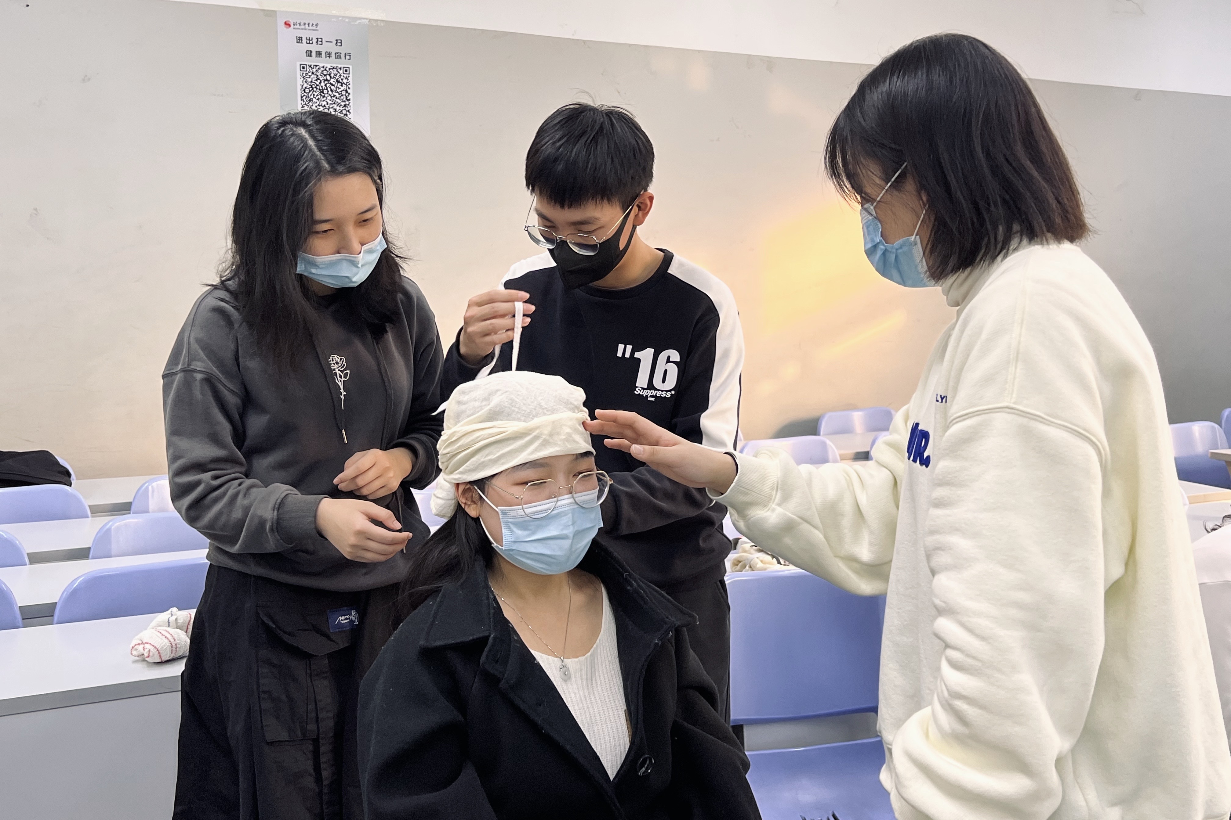 邹晨诺(右一)在学校组织的应急救护培训中学习包扎技巧。(受访者供图)
