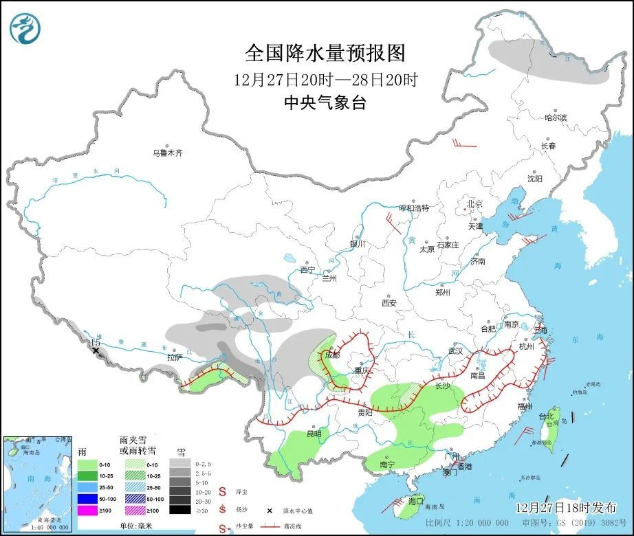 27日20时至28日20时,西藏东部和南部、青海南部、云南西北部、内蒙古东北部、黑龙江北部等地部分地区有小到中雪或雨夹雪,其中,西藏南部部分地区有大雪或暴雪。
