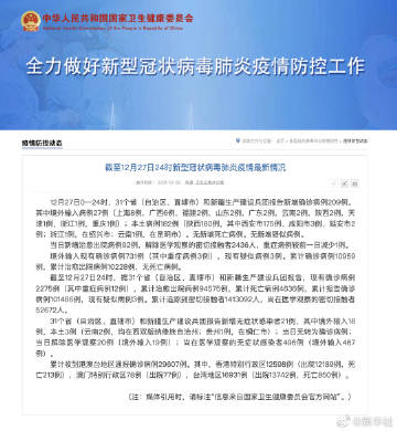 截至12月27日24时,据31个省(自治区、直辖市)和新疆生产建设兵团报告,现有确诊病例2275例(其中重症病例12例),累计治愈出院病例94575例,累计死亡病例4636例,累计报告确诊病例101486例,现有疑似病例3例。累计追踪到密切接触者1413092人,尚在医学观察的密切接触者52672人。