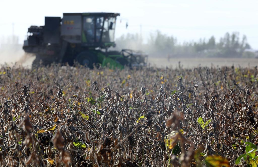 2021年10月16日,在河北省石家庄市藁城区梅花镇朱家庄村,农户驾驶农机收割大豆。新华社发(梁子栋摄)