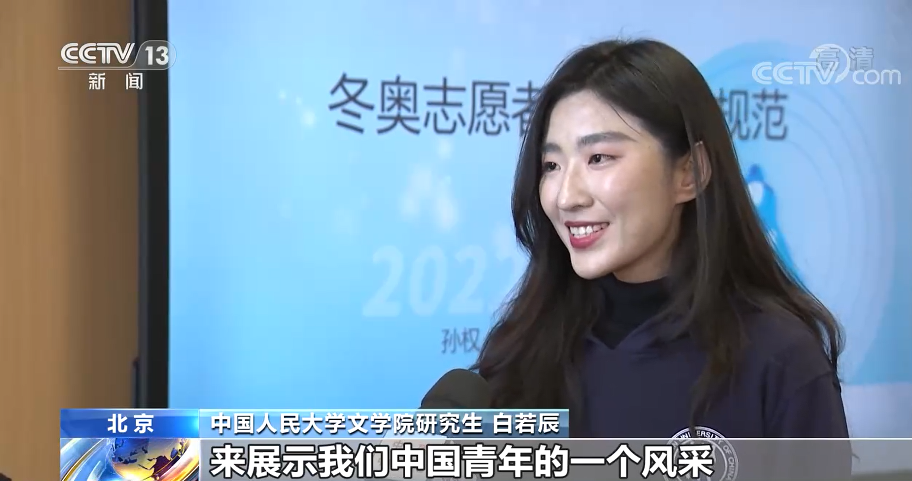 中国人民大学文学院研究生 白若辰:马上就要进入这个正赛的闭环管理了,我们也在做着最后的准备和冲刺。非常希望能通过冬奥会这个平台来展示我们中国青年的一个风采,也希望能通过我们人大学子去传播冬奥文化,传播冬奥知识,贡献我们自己的一份力量。