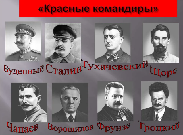 苏俄内战红军指挥官(上左至右)布琼尼、斯大林、图哈切夫斯基、肖尔斯;(下左至右)恰巴耶夫、伏罗希洛夫、伏龙芝、托洛茨基)