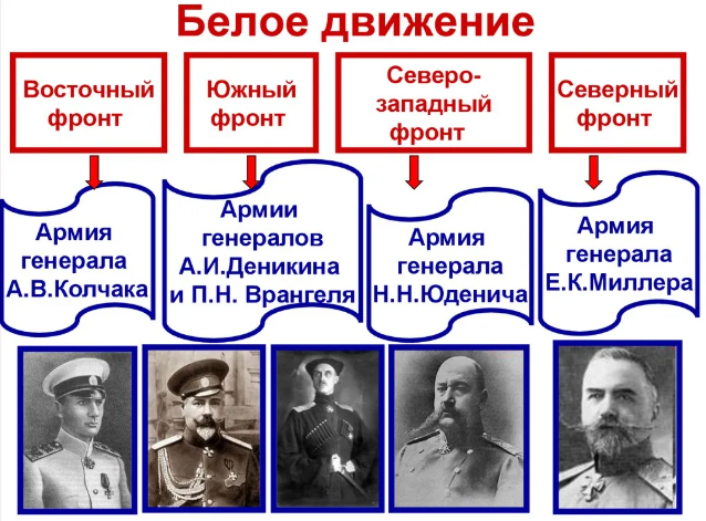 苏俄内战白军将领(从左至右)高尔察克、邓尼金、弗兰格尔、尤登尼奇、米勒