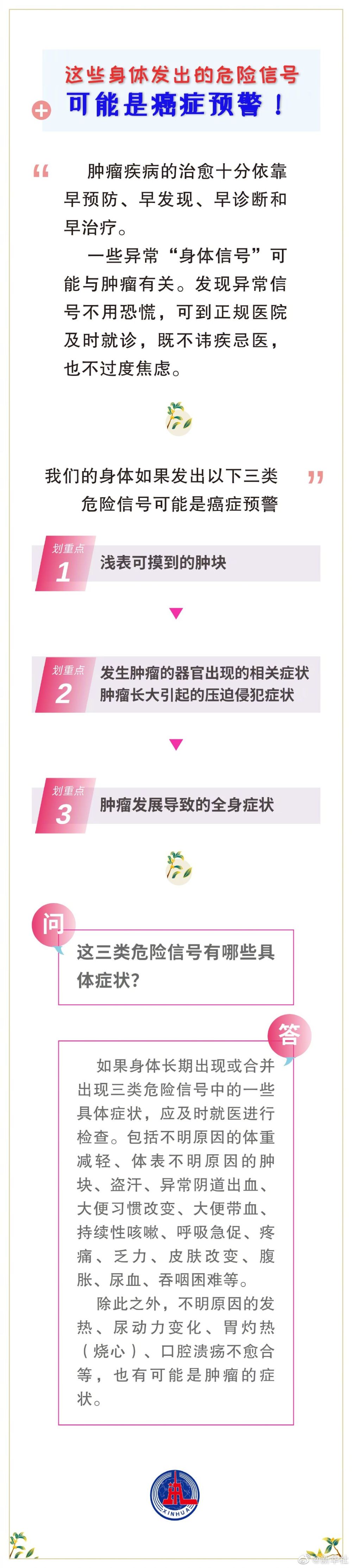 【身体发出的这些信号可能是癌症预警】随着现代医学的不断发展进步,肿瘤的治疗水平较以往有明显提高,但肿瘤疾病的治愈依然十分依靠早预防、早发现、早诊断和早治疗。一些异常“身体信号”可能与肿瘤有关。发现异常信号不用恐慌,可到正规医院及时就诊,既不要讳疾忌医,也不用过度焦虑。戳图了解↓