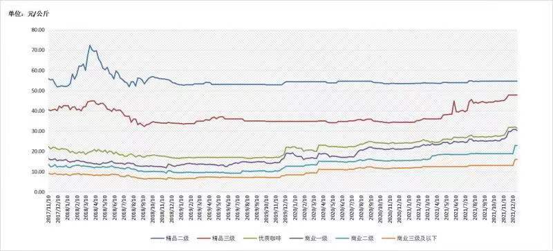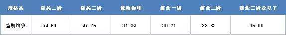 具体来看,精品二级咖啡豆均价报54.60元/公斤,较上期持平;精品三级咖啡豆均价报47.76元/公斤,较上期持平;优质咖啡豆均价报31.34元/公斤,较上期下跌0.69元/公斤,跌幅2.15%;商业一级咖啡豆均价报30.27元/公斤,较上期下跌0.60元/公斤,跌幅1.94%;商业二级咖啡豆均价报22.83元/公斤,较上期下跌0.02元/公斤,跌幅0.09%;商业三级及以下咖啡豆均价报16.00元/公斤,较上期持平。