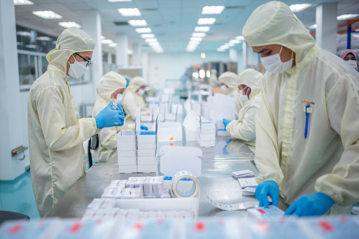 2021年10月5日,在马来西亚吉隆坡郊区的发马公司灌装工厂,工人在包装本地灌装生产的科兴疫苗。新华社记者朱炜摄