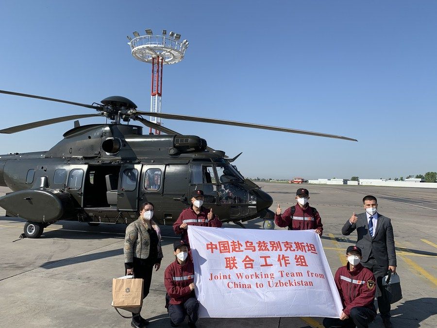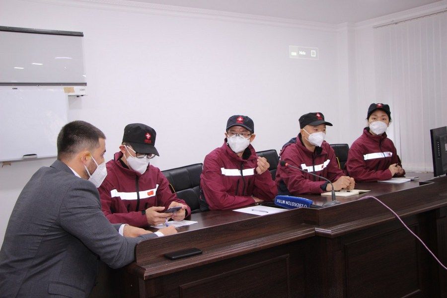 2020年4月19日,在乌兹别克斯坦撒马尔罕,穆罗江·肯杰柏耶夫(左一)为中国政府联合医疗工作组翻译。新华社发