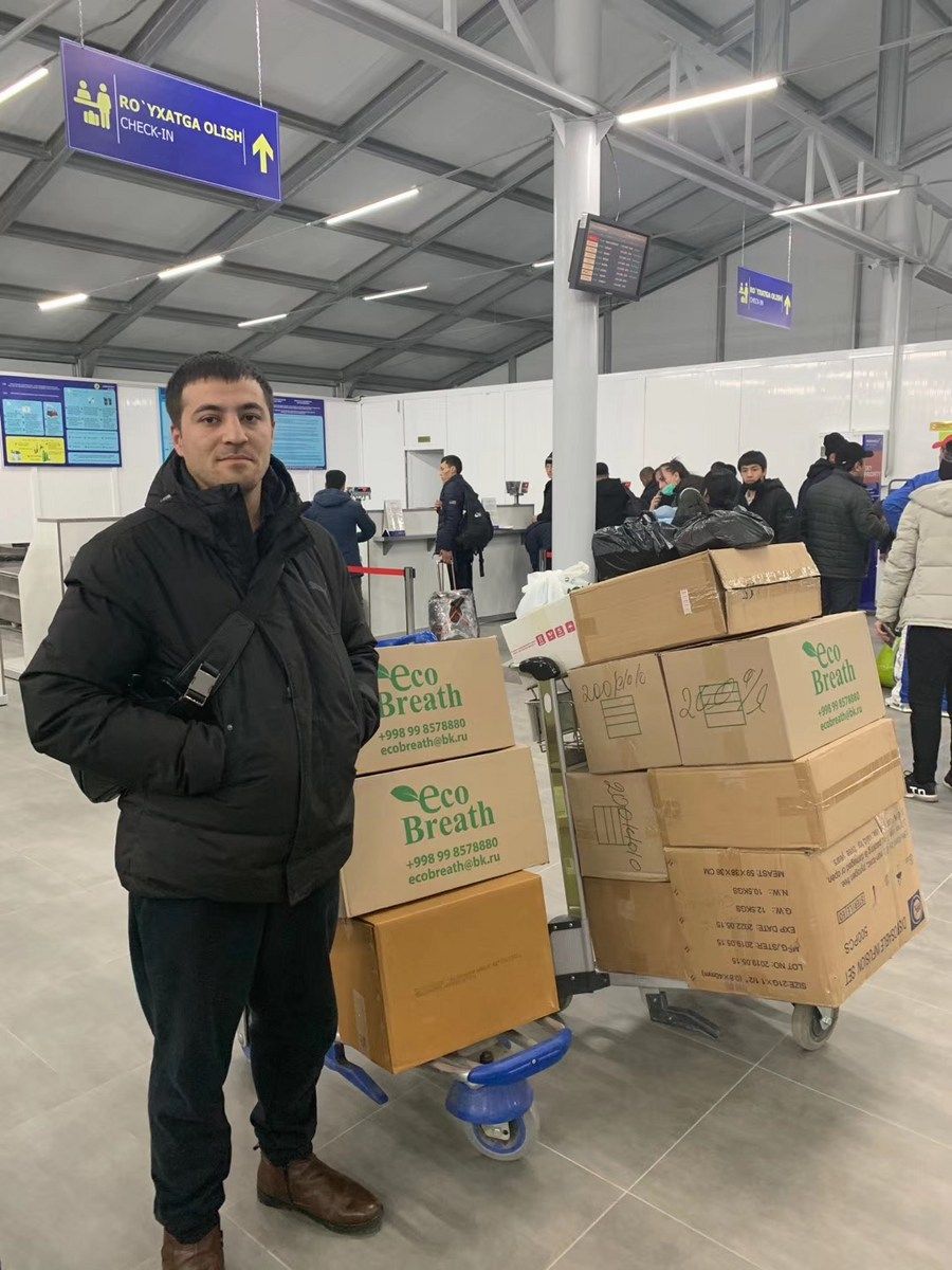 2020年1月31日,在乌兹别克斯坦撒马尔罕国际机场,肯杰柏耶夫将自费采购的口罩亲自送往中国。新华社发