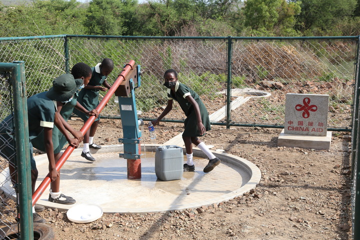 2021年11月3日,在津巴布韦南马塔贝莱兰省省会关达的塞农多小学,学生从中国援建水井里打水。新华社发(陈雅琴摄)