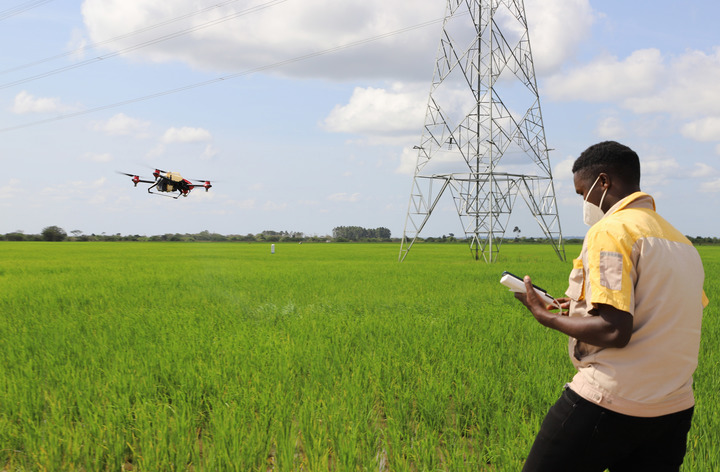 6月2日,在乌干达卡隆古区卢卡亚镇中亿农业园,作业员赫伯特·阿加巴操控植保无人机喷洒农药。2014年,中国企业开始在卢卡亚镇的滩涂中开发农业。新华社记者张改萍摄
