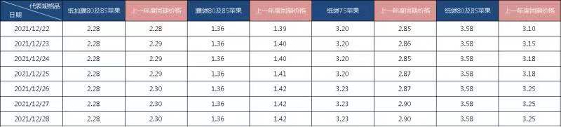 指数监测显示,截至12月28日,纸加膜80及85规格富士苹果均价为2.28元/斤,膜袋80及85规格富士苹果均价为1.36元/斤,纸袋75规格富士苹果均价为3.23元/斤,纸袋80及85规格富士苹果均价为3.58元/斤。