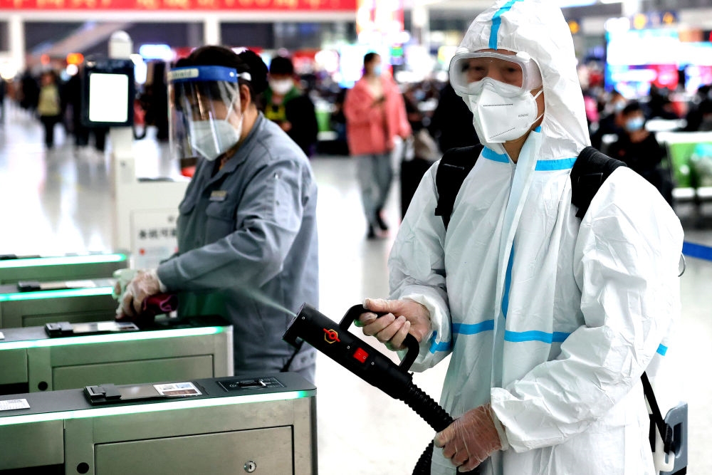 11月27日,工作人员在上海虹桥火车站对检票口进行定时保洁和消毒。新华社记者 陈飞 摄