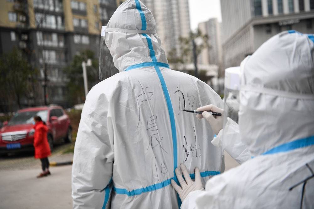 12月27日,在西安市雁塔区孟村小区,社区工作人员在防护服上写加油标语。新华社记者 张博文 摄