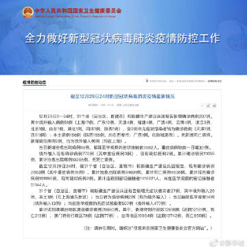 【#12月29日新增确诊病例207例# #12月29日新增本土病例156例#】据国家卫健委官网消息,12月29日0—24时,31个省(自治区、直辖市)和新疆生产建设兵团报告新增确诊病例207例。其中境外输入病例51例(上海17例,广东10例,天津4例,福建4例,广西4例,云南4例,浙江3例,北京1例,山东1例,湖北1例,四川1例,陕西1例),含2例由无症状感染者转为确诊病例(天津1例,四川1例);本土病例156例(陕西155例,均在西安市;广西1例,在防城港市)。无新增死亡病例。新增疑似病例2例,均为境外输入病例(均在上海)。