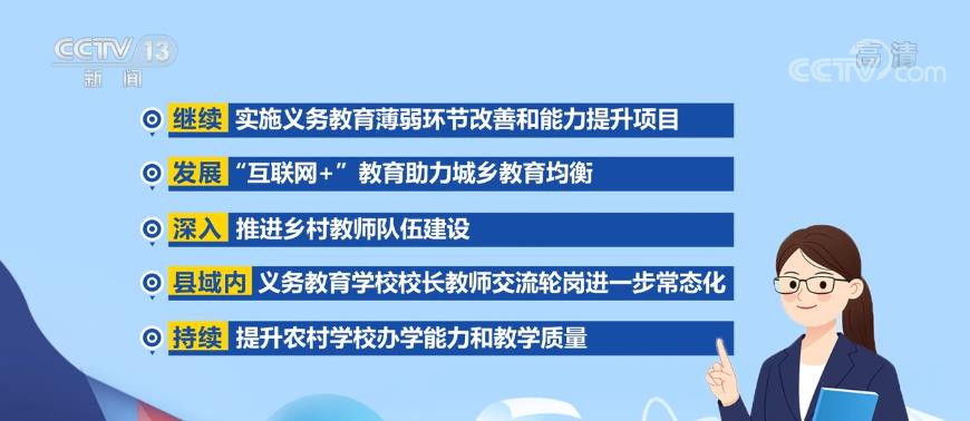 继续实施义务教育薄弱环节改善和能力提升项目,发展“互联网+”教育助力城乡教育均衡,深入推进乡村教师队伍建设,县域内义务教育学校校长教师交流轮岗进一步常态化,持续提升农村学校办学能力和教学质量。