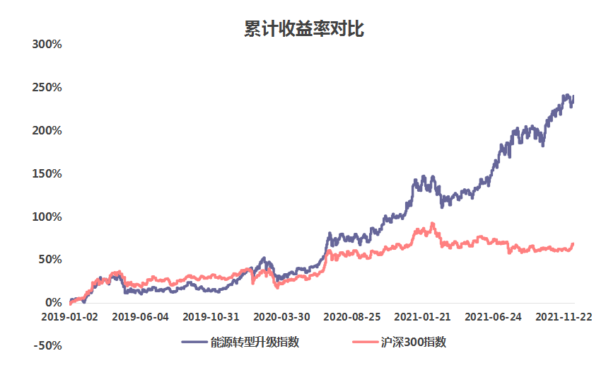 该指数覆盖13个行业,涵盖板块主要涉及新能源、智慧电网、清洁能源生产、资源保障和元器件保障等。成分股选择上,深度拆分个股收入结构,以更精准的数据筛选业务与能源转型升级强关联,并基于基本面等指标精选出100只股票。指数以2018年12月31日为基日,以1000点为基点,每季度调整1次样本。运行结果显示,基期以来,指数整体呈上升走势,至今累计收益率超过200%,相比同期基准指数超额收益明显。