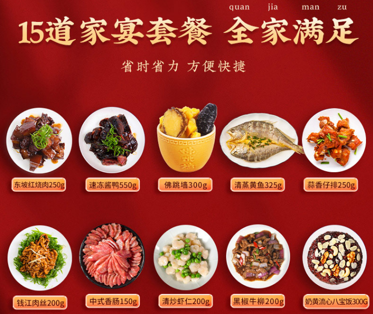 “年夜饭半成品套餐,14道家宴398元”“春节团圆饭私房预制菜,12道家宴298元”“宫保鸡丁、咕咾肉、老坛酸菜鱼、素什锦……年夜饭半成品8道菜248元”。详情>>
