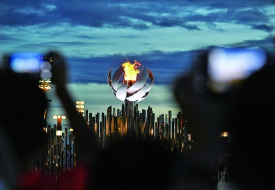 8月8日傍晚,人们在日本东京湾的“梦之大桥”上拍摄奥运圣火台。新华社发