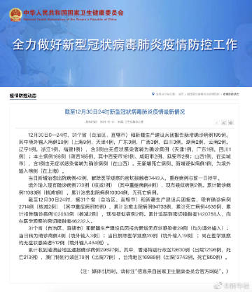 截至12月30日24时,据31个省(自治区、直辖市)和新疆生产建设兵团报告,现有确诊病例2714例(核减2例)(其中重症病例15例),累计治愈出院病例94733例,累计死亡病例4636例,累计报告确诊病例102083例(核减2例),现有疑似病例2例。累计追踪到密切接触者1420758人,尚在医学观察的密切接触者46232人。