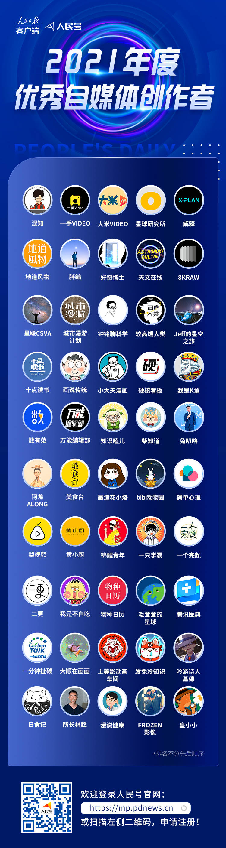 近日,人民号2021年度优秀创作者名单正式发布。名单根据文章质量、文章数量、影响力指数等多个维度综合评定得出。优秀创作者涵盖政务、媒体、自媒体、高校领域,涉及科普、健康、美食、财经、文化、艺术等十几个垂类,恭喜各位创作者!