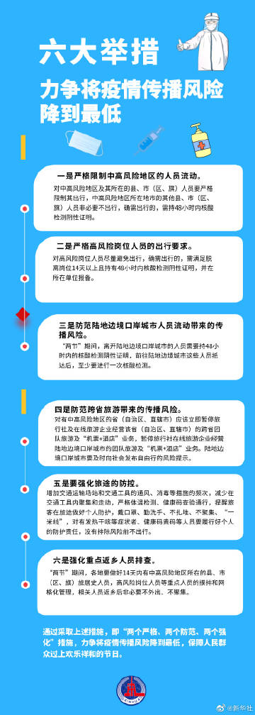 【国家卫健委:#六大举措力争将疫情传播风险降到最低#】元旦、春节将至,国家卫健委日前召开国务院联防联控机制新闻发布会,在总结前期节假日期间疫情防控特点和处置经验的基础上,提出了在疫情形势总体平稳前提下,强化人员安全有序流动,主要措施包括以下六个方面,戳图了解↓(记者李恒)