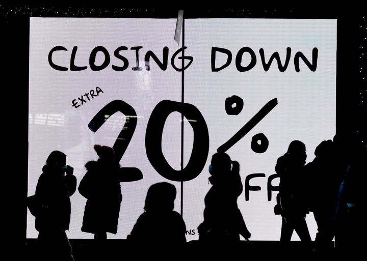 12月26日,人们经过英国伦敦牛津街一家商店的打折信息电子屏。新华社记者李颖摄
