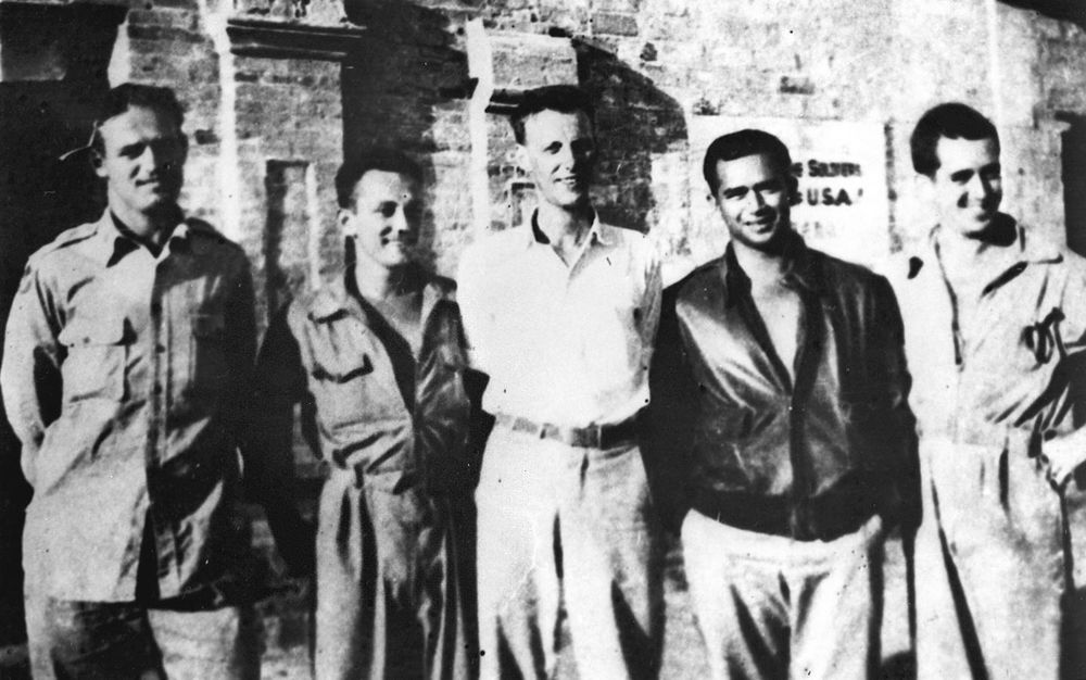 二战期间,被新四军营救的5名美国“飞虎队”飞行员在新四军驻地合影(资料照片,1944年8月摄)。新华社发