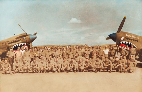 在二战时期的中国,美国第14航空军第23战斗团第76中队成员在两架涂着“鲨鱼嘴”标志的“飞虎队”战斗机前合影(资料照片)。新华社发