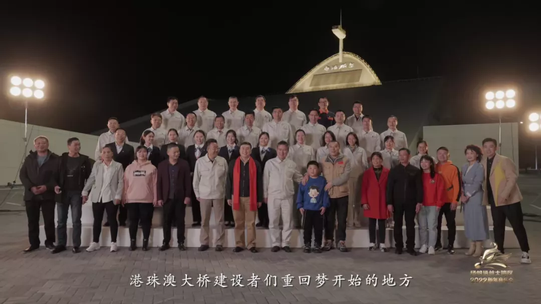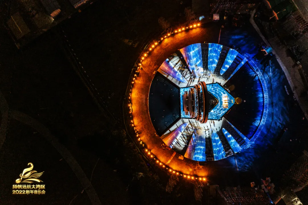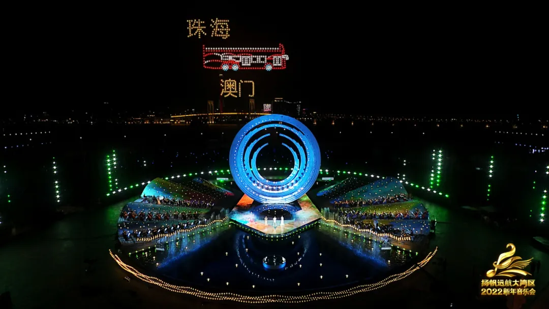 从天空俯瞰,新年音乐会主舞台自水面破浪而出、气势如虹,舞台背后是珠海的满城璀璨,远处是连接粤港澳三地的港珠澳大桥,三者汇聚在一起,构成了繁华、恢宏、震撼人心又绰约多姿的壮丽景观。