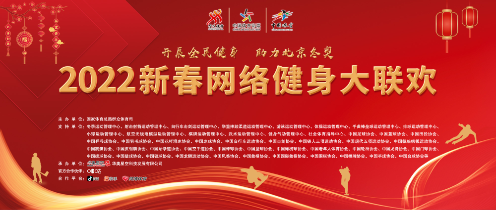 12月31日,由国家体育总局群众体育司主办,国家体育总局各直属单位、各国家级体育协会(社团组织)支持,华奥星空承办的2022年“新春网络健身大联欢”活动正式上线,活动报名通道将于2022年1月1日零时正式开通。