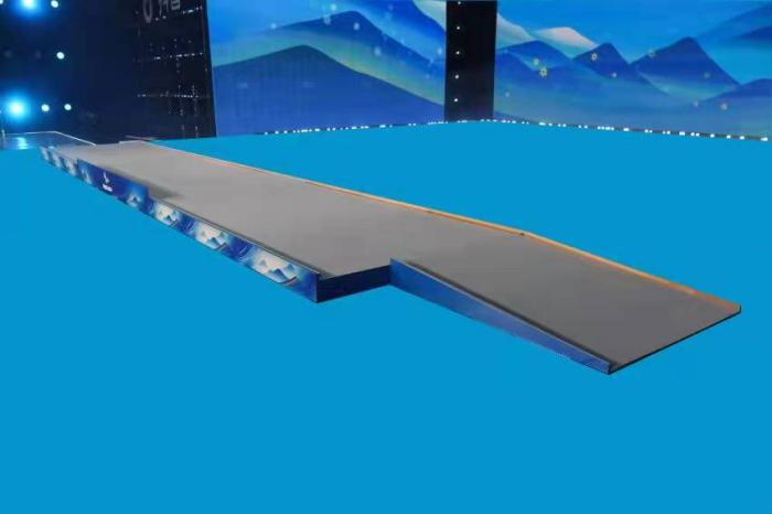 以北京冬奥会色彩系统中的“天霁蓝”为主体颜色,运用核心图形与冰雪线条,整体形象简约、大方。箱体制作材料为可回收环保材料,蜂窝状内芯增强承重力的同时减轻自身重量,台面铺设抗低温防滑软垫,满足冰雪项目使用要求。同时,采用模块化组合拼插方式,能够快速搬运拼装,满足从单人项目到多人项目的快速转换需求。冬残奥会颁奖台外观设计与冬奥会保持一致,为满足残疾运动员的需要,增设了无障碍坡道设计。