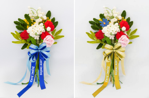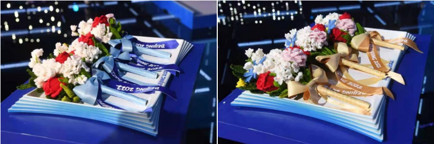为了践行节俭、可持续的办奥理念,北京2022年冬奥会和冬残奥会采用手工绒线编结花束作为颁奖花束,在奖牌颁发仪式中与奖牌一同颁发给获奖运动员。绒线花束既保留了奥运颁奖仪式中花束的形制,又践行了可持续的理念,寓意着温暖、祥和,可永久保存,成为“永不凋谢的奥运之花”。