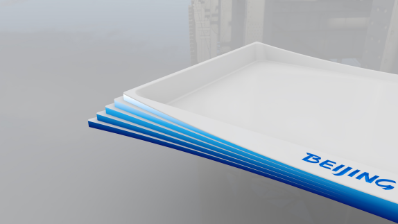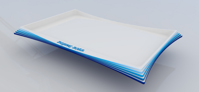 造型似打开的书页,寓意通过北京冬奥会向世界翻开了中国文化和各国友好的新篇。托盘边缘采用蓝白渐变的设计,呈现出“晕染”的东方美学意境,象征着中国文化与世界文化的交融,体现了中国开放、友好、和平、包容的心胸。托盘采用环保材料制作,盘面铺垫了防滑硅胶垫,有效避免奖牌和纪念品滑落。