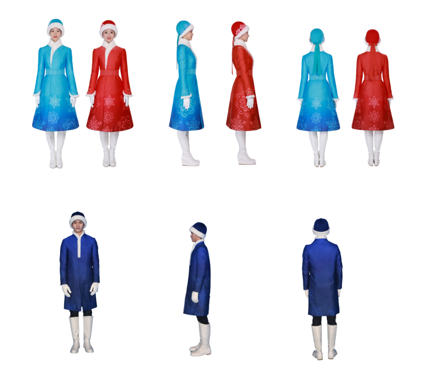 三个系列的颁奖服装都分为引领员服装和托盘员服装,分别以蓝色和红色区分。每套颁奖服装都包括外套、帽子、手套、防滑长靴、自发热保暖内衣等套件。