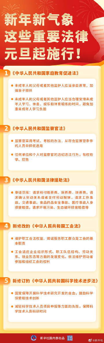 【权威快报|#一批重要法律元旦起正式施行#】当新年的钟声敲响,一批关系国计民生的重要法律也从2022年1月1日起正式施行。①#家庭教育促进法要求避免加重未成年人学习负担#②监察官法明确监察官队伍选用标准与履职要求③法律援助法扩大法律援助覆盖群体④工会法维护新就业形态劳动者权利⑤科技进步法明确保障科学技术人员科研时间……新年新气象,法治阳光的温暖,更好增进百姓福祉。戳大图了解!