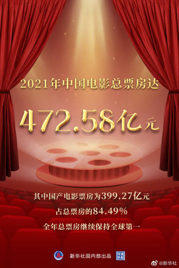 #中国电影全年总票房继续保持全球第一#【权威快报|#2021年我国电影总票房达472.58亿元#】国家电影局2022年1月1日发布数据,2021年中国电影总票房达472.58亿元,其中国产电影票房为399.27亿元,占总票房的84.49%。全年新增银幕6667块,银幕总数达到82248块。中国电影产业快速复苏发展,全年总票房和银幕总数继续保持全球第一。(记者王鹏,海报设计乔昕)