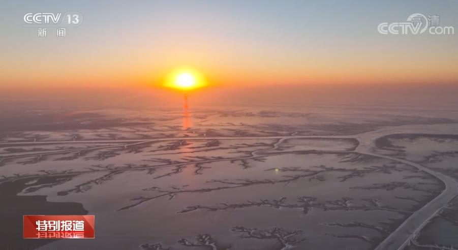央视网消息:这里是位于山东东营的黄河三角洲。大河浩荡,黄河奔腾万里,在这里汇入茫茫渤海。潮汐往返,冲刷出树状的沟壑,宛如大自然的神奇画作。朝霞给大地铺上一层金辉。水波荡漾之间,片片浅滩上芦花如雪。