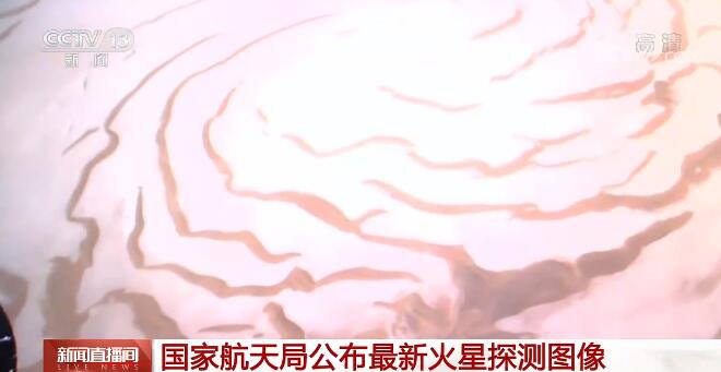 在火星北极冰盖图像中,白色区域为覆盖在北极的“冰”原,由干冰也就是固态二氧化碳和水冰组成,红色和暗色区域则为裸露的地表。经过常年沉积和消融呈现出以极点为中心的白色冰层和裸露地表组成的环形螺旋状地貌。